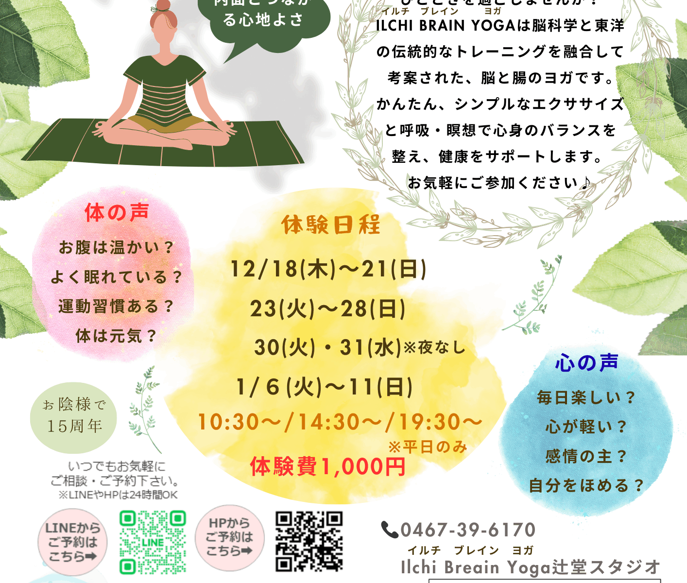 深い呼吸を通して、からだと心の声に耳を傾けるひとときを過ごしませんか?ILCHI Brain Yogaは、脳科学と東洋の伝統的なトレーニングを融合して考案された、脳と腸のヨガです。 かんたん、シンプルなエクササイズと呼吸・瞑想で心身のバランスを整え、健康をサポートします。お気軽にご参加ください♪