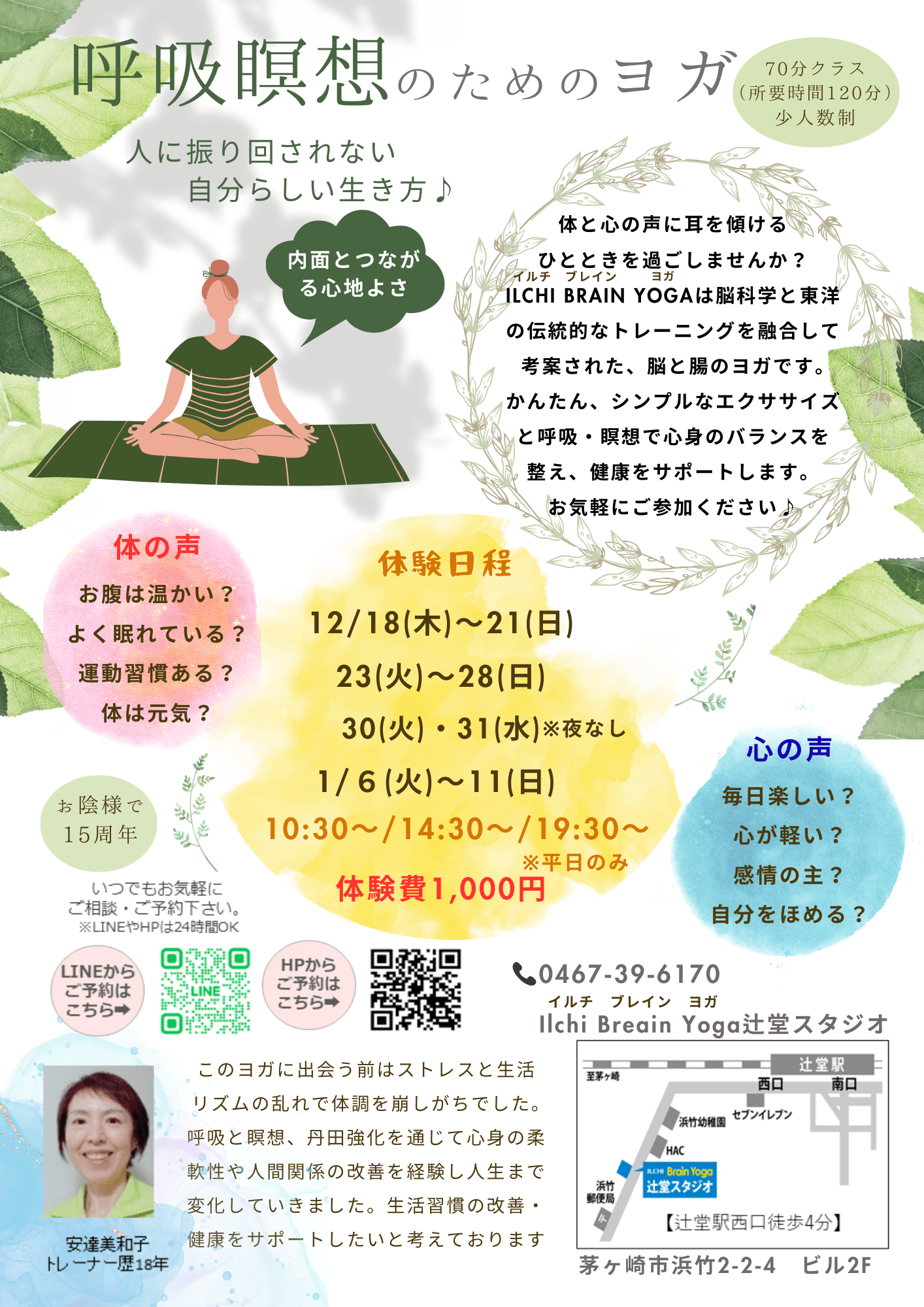 【湘南茅ヶ崎 平塚 藤沢ヨガ】イルチブレインヨガ辻堂スタジオ|辻堂駅南口より徒歩8分 体と心と脳のヨガ